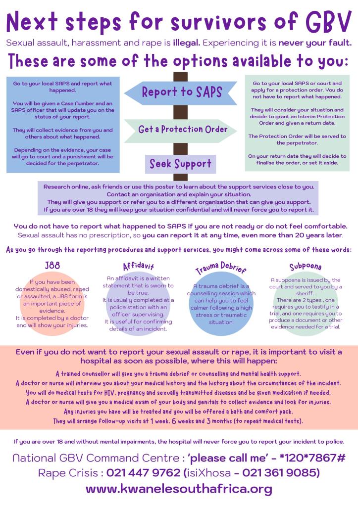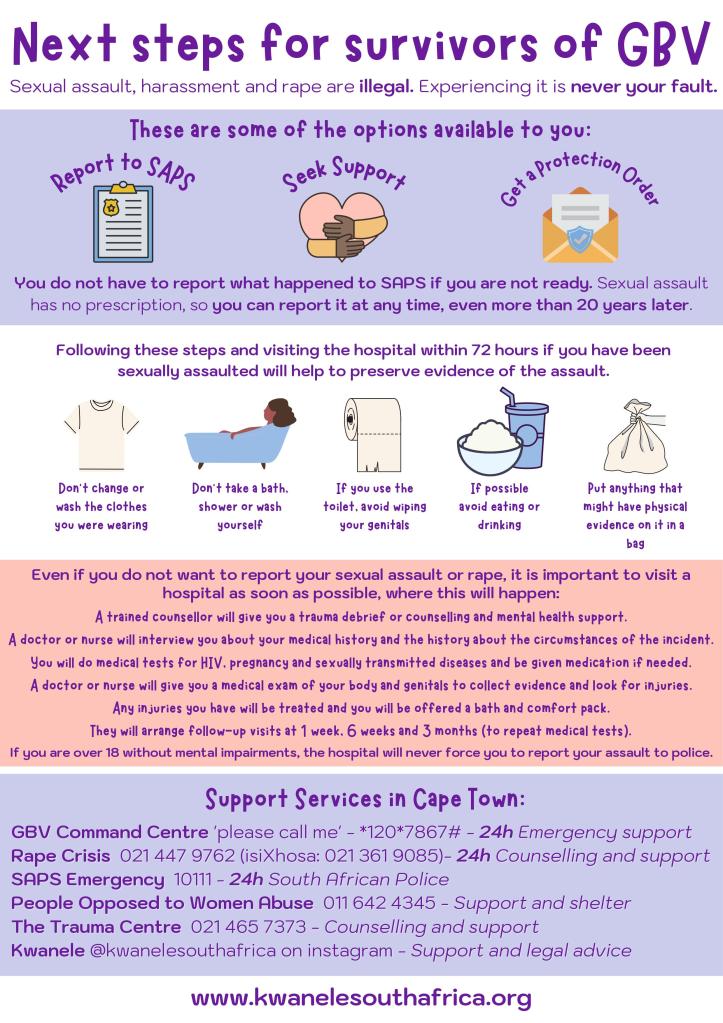 from January to May 2022 I completed an internship for Kwanele, a South African NPO based in Cape Town. Kwanele supports South Africans affected by gender-based violence using technology as well as face-to-face. as part of my work I organised community meetings, produced educational resources, and provided one-on-one support to survivors of domestic violence. I researched, wrote and designed a series of infographics available to view below, and personally distributed informative posters to nighttime venues across Cape Town, as part of which I met with owners and managers of nighttime venues in order to enquire about their anti-harassment policies and to encourage them to improve/introduce such polices where necessary.